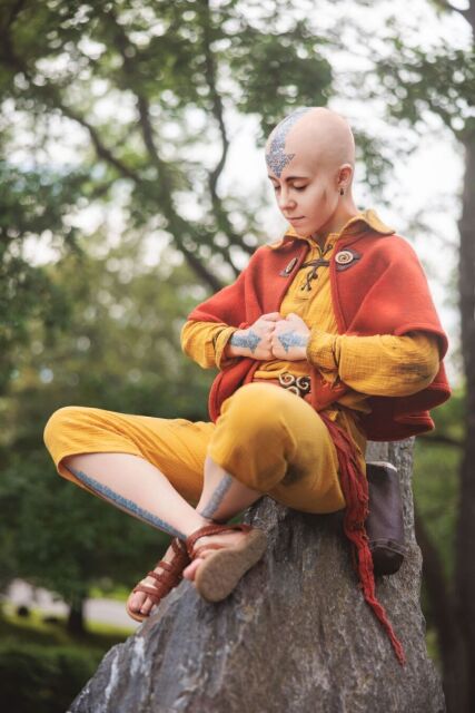 Woahhh what an amazing Aang Cosplay!! The tattoos are so intricate, they look like you actually have those 🤯