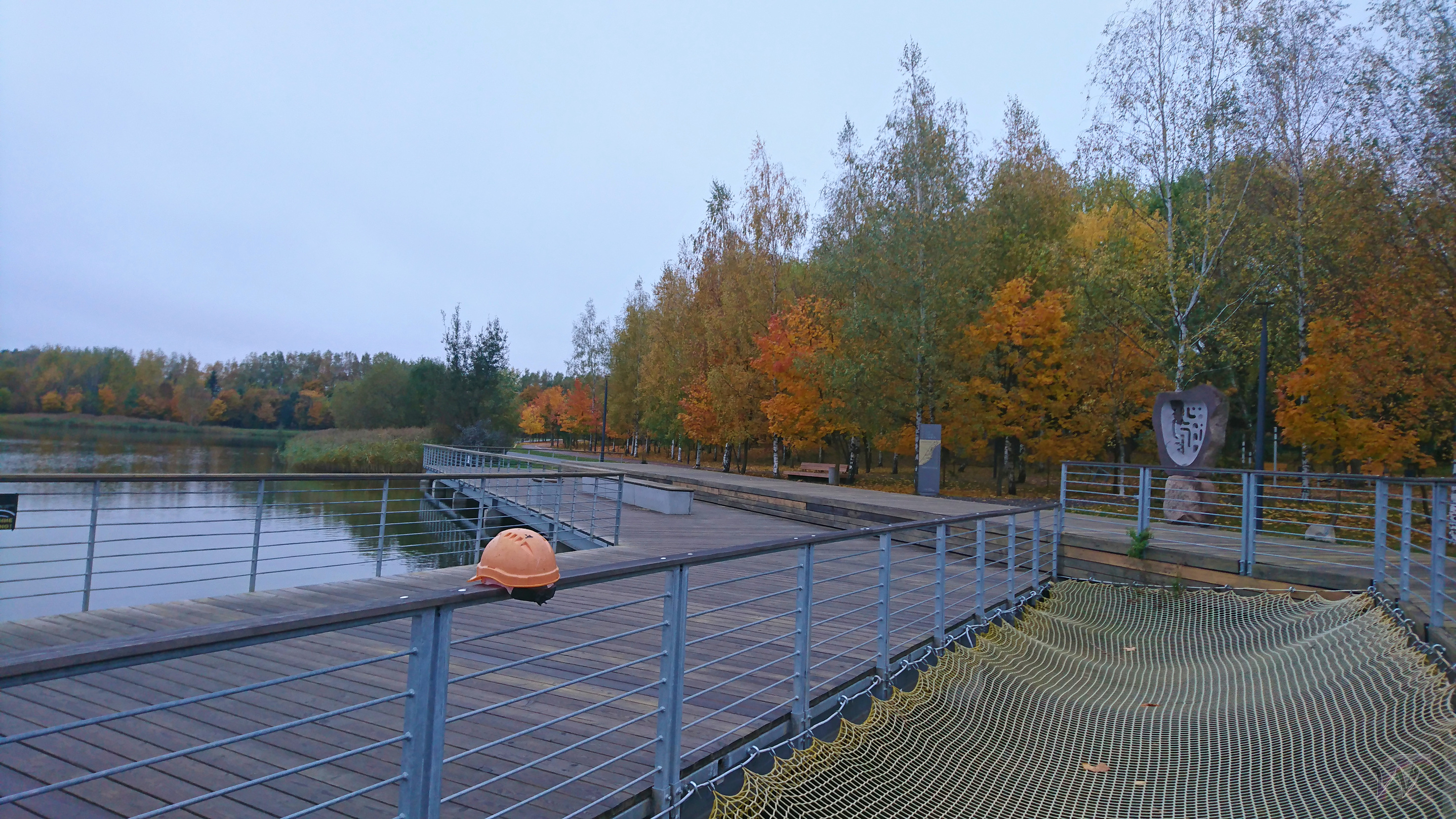 Утро в осеннем парке Тихое, безветренное и тёплое — для этого времени. И ещё щедро раскрашенное природой... А забытая кем-то на перилах строительная каска почему-то навеяла забавный образ медведя строителя — "ушёл спать до весны". 😊️ #photography #WTphoto #landscape #nature #autumn #осень #природа #пейзаж