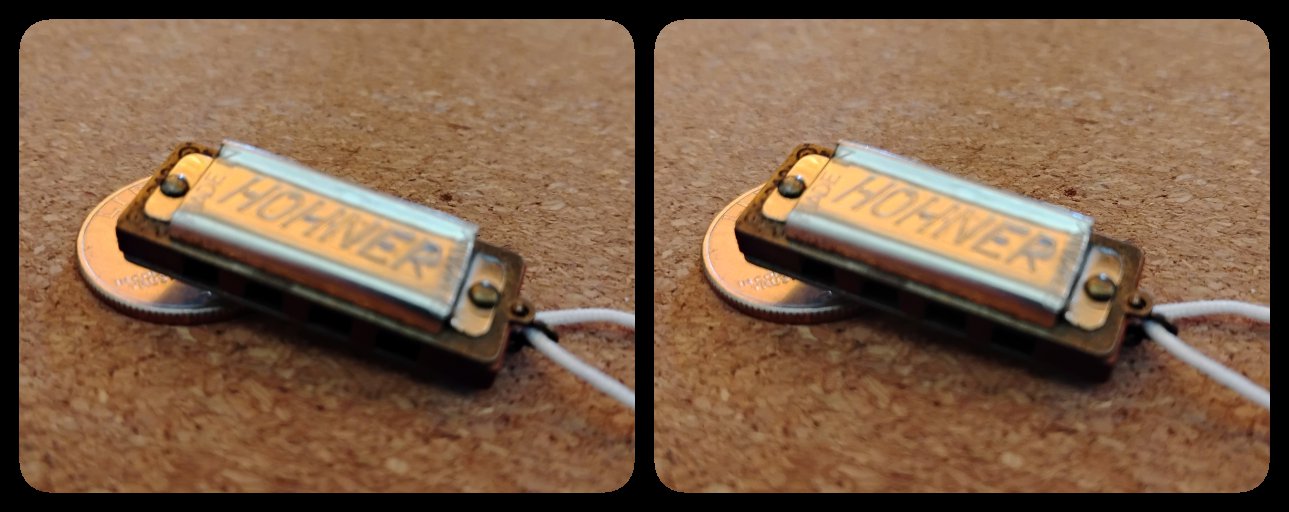Hohner #harmonica. It might be a "Little Lady," it might be a "Mini." It has features of both. Lanyard and reed plates match the Little Lady, but it doesn't say "Little Lady" on either cover plate. I suspect they may have run out of that part and just used the side that says "Hohner" twice. Anyway, it's an oddball -- unlike every other tiny harmonica I've seen, it's not in the key of C, but the key of A. I can't find anything online about Hohner making these things in unusual keys. It's not like there's any reason a professional harmonica player would want one of each in all keys... Someday, I'd like to find the similar, off-brand "Pee-Wee" harmonica, after which Paul Rubens named his character. #Stereoscopic and #anaglyph view. #stereoscopy #stereoskopie #3Dphotography #3Dfotografie #stéréoscopie #StereoPhoto #StereoPhotography #stereobild