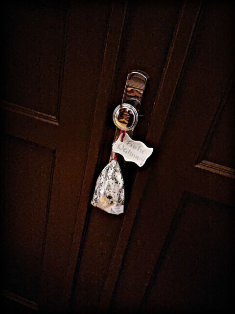 Dieses Beutelchen enthielt leckere selbstgebackene Kekse. Ich fand es vor 3 Wochen früh an meiner Wohnungstür, als ich den Müll runtergebracht habe. Auf meinem Weg nach unten sah ich, dass an allen Wohnungstüren so eine Glitzerbeutel hing.