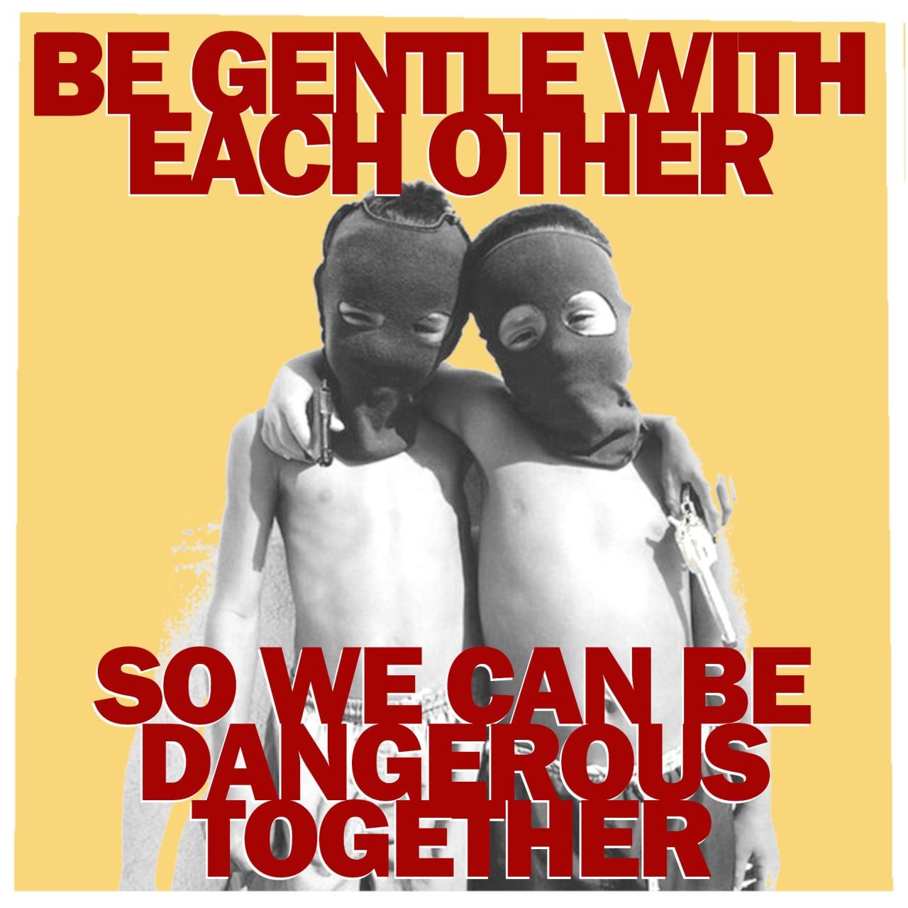 @AnarchistArt@mastodon.social Zwei Kinder mit nacktem Oberkörper, Pistolen, die Gesichter mit Sturmhauben vermummt. Text: Be gentle with each other, so we can be dangerous together (seid nett/freundlich/höflich zueinander, dann können wir gemeinsam gefährlich sein)