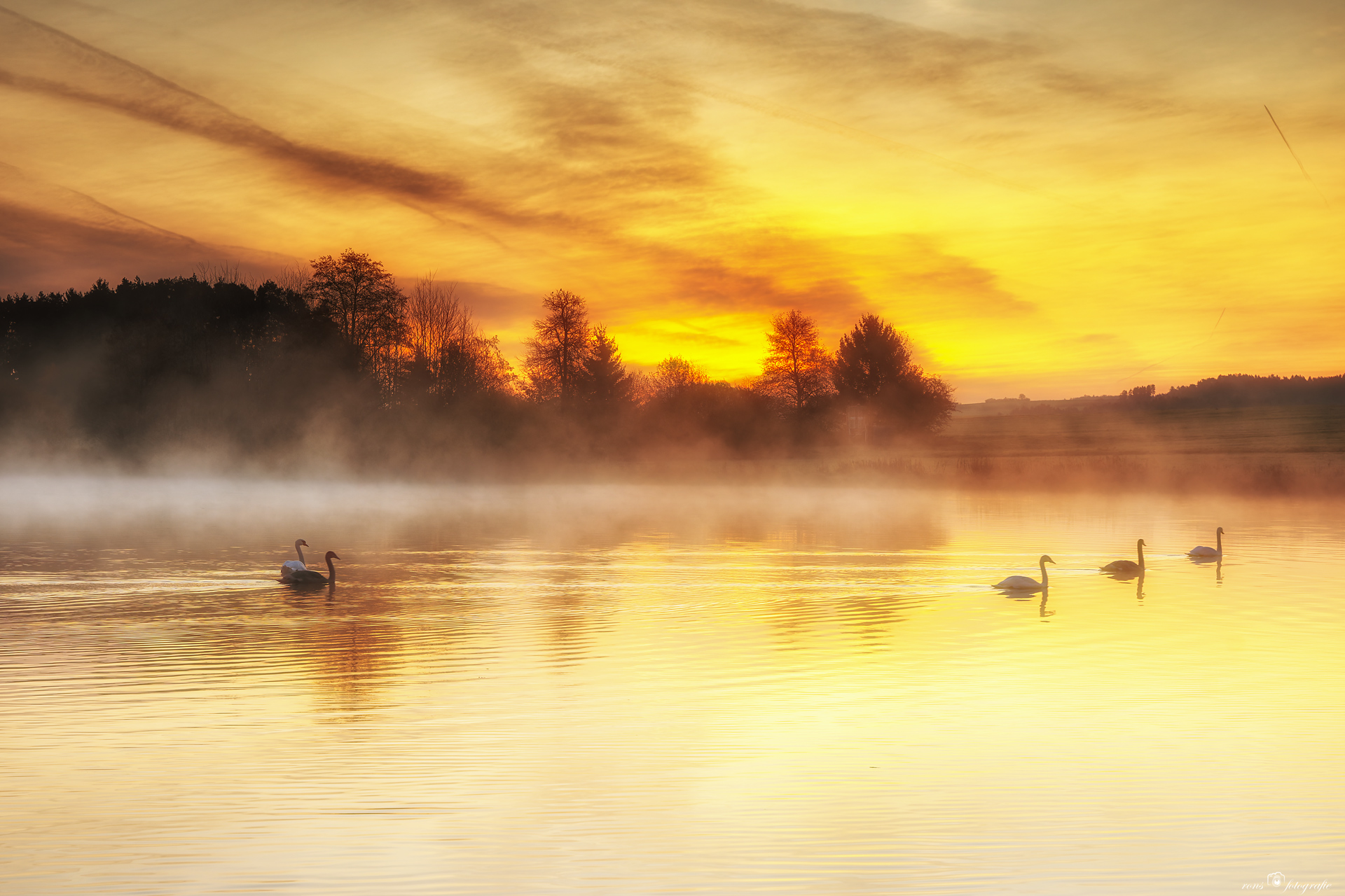 Ein nebliger Sonnenaufgang und die Ruhe der Schwäne.