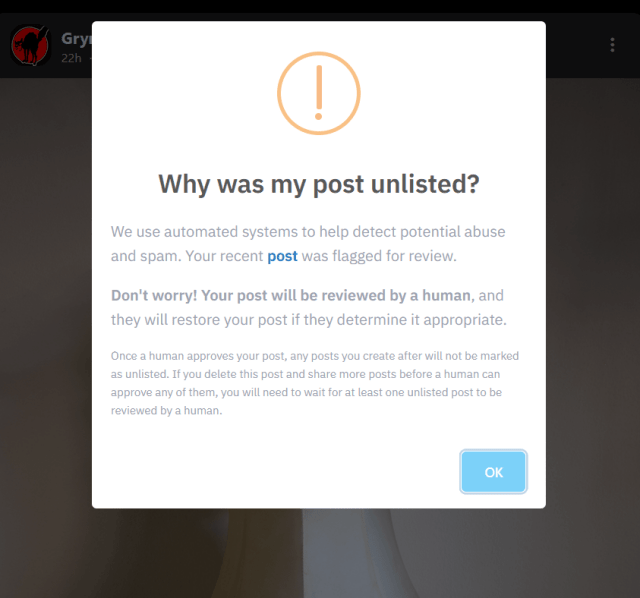 It seems some kind of AI is censoring me because I posted the wrong picture, deleted it and uploaded a slightly different version again. It now thinks I'm some kind of spammer. Sorry to say, but this does feel like the FB algorhytm deleting all kinds of stuff. I of course understand the need to prevent spam, but just with one picture that was deleted by me before it was uploaded again, it doesn't feel like a warm welcome. Luckily I know the fediverse works on completely different base, and luckily the interactions are different too. (Thanks again @Unterholz)